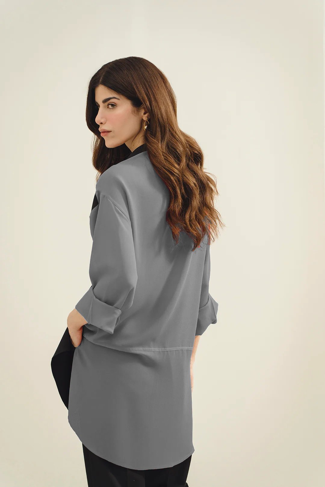 • Shirt: Button-down, longline fit with roll-up sleeves