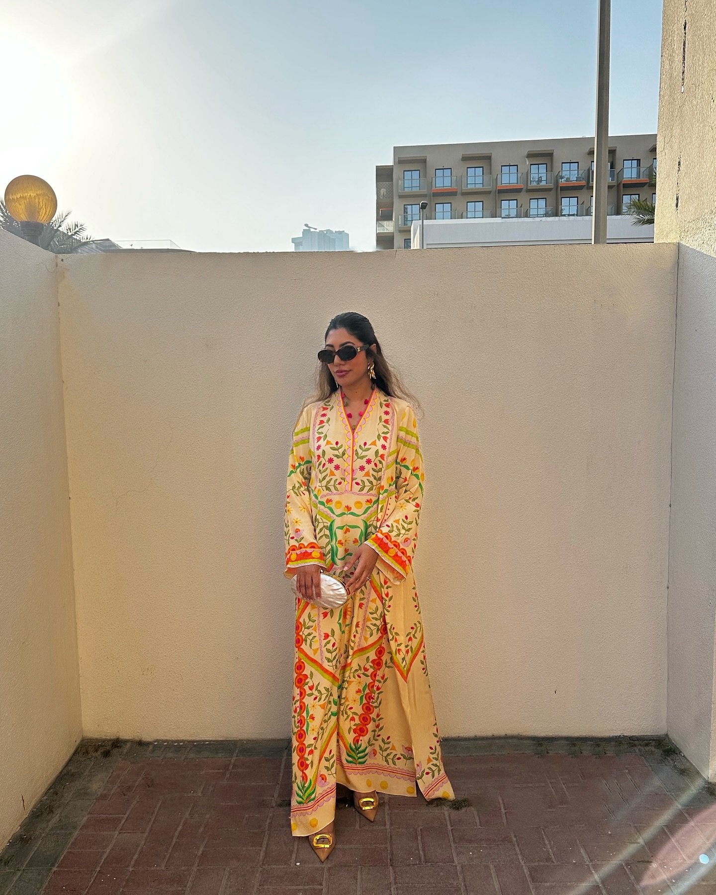 Color: Light beige kaftan with colorful floral prints