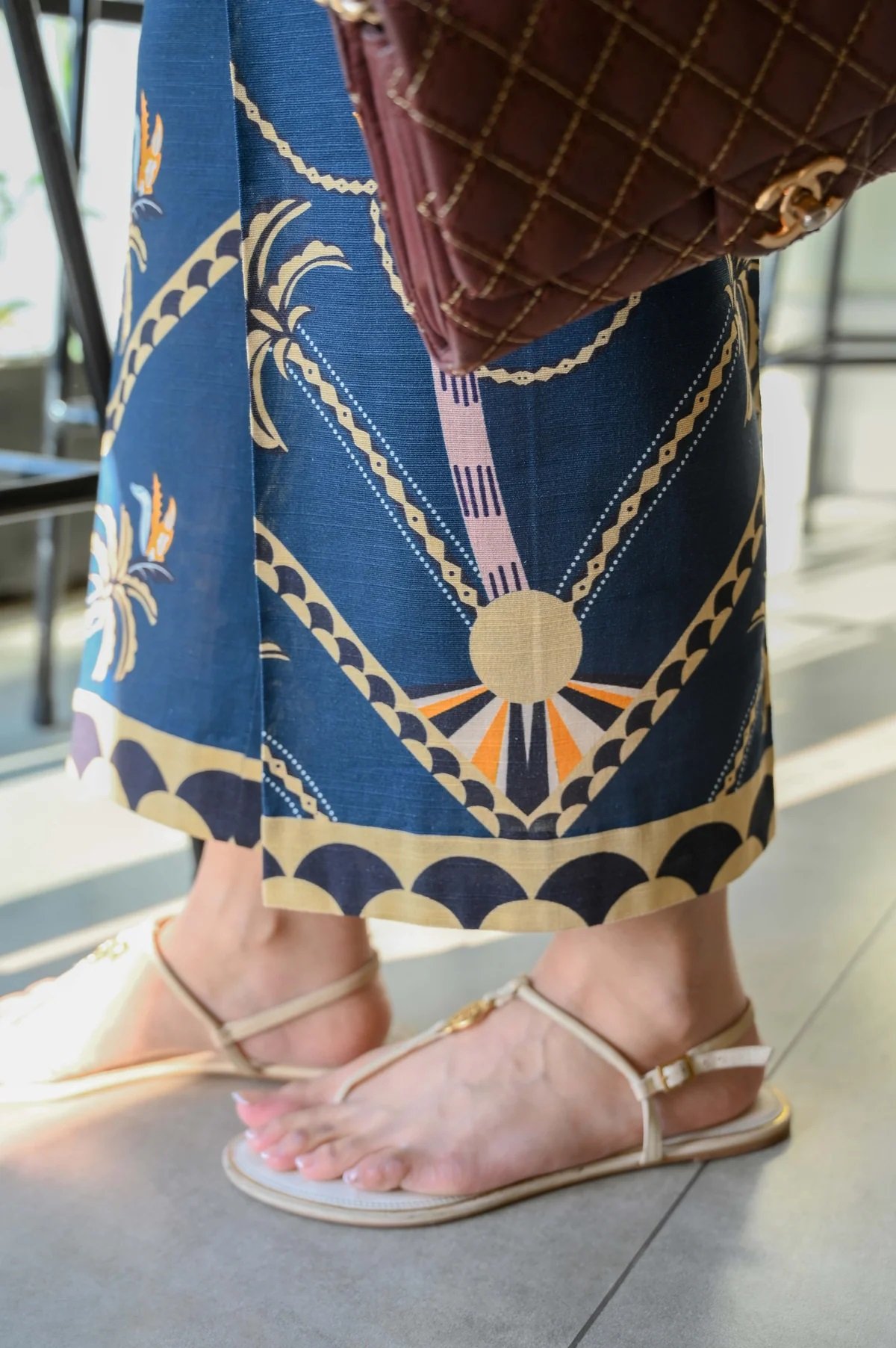 Color: Navy blue with soft pink and beige palm tree prints